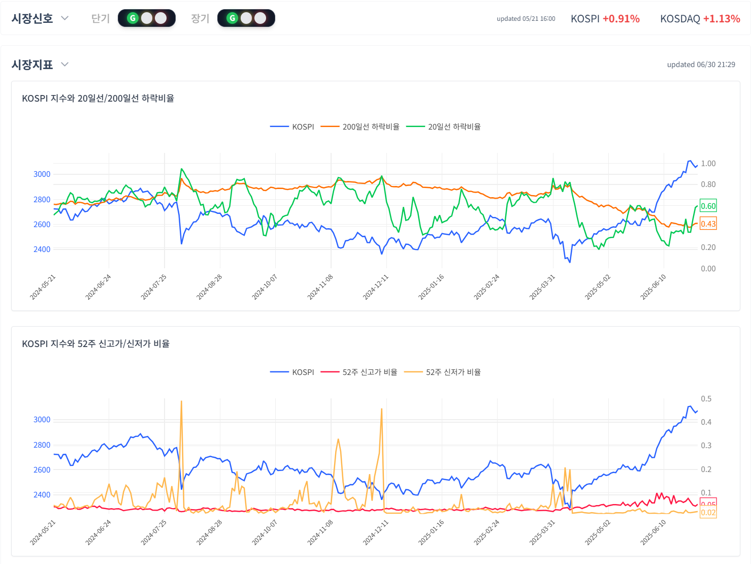 신호등 기반의 위험도와 단기·장기 시그널을 한 화면에서 확인하며, 급변하는 장세에서도 리스크를 빠르게 관리할 수 있습니다.